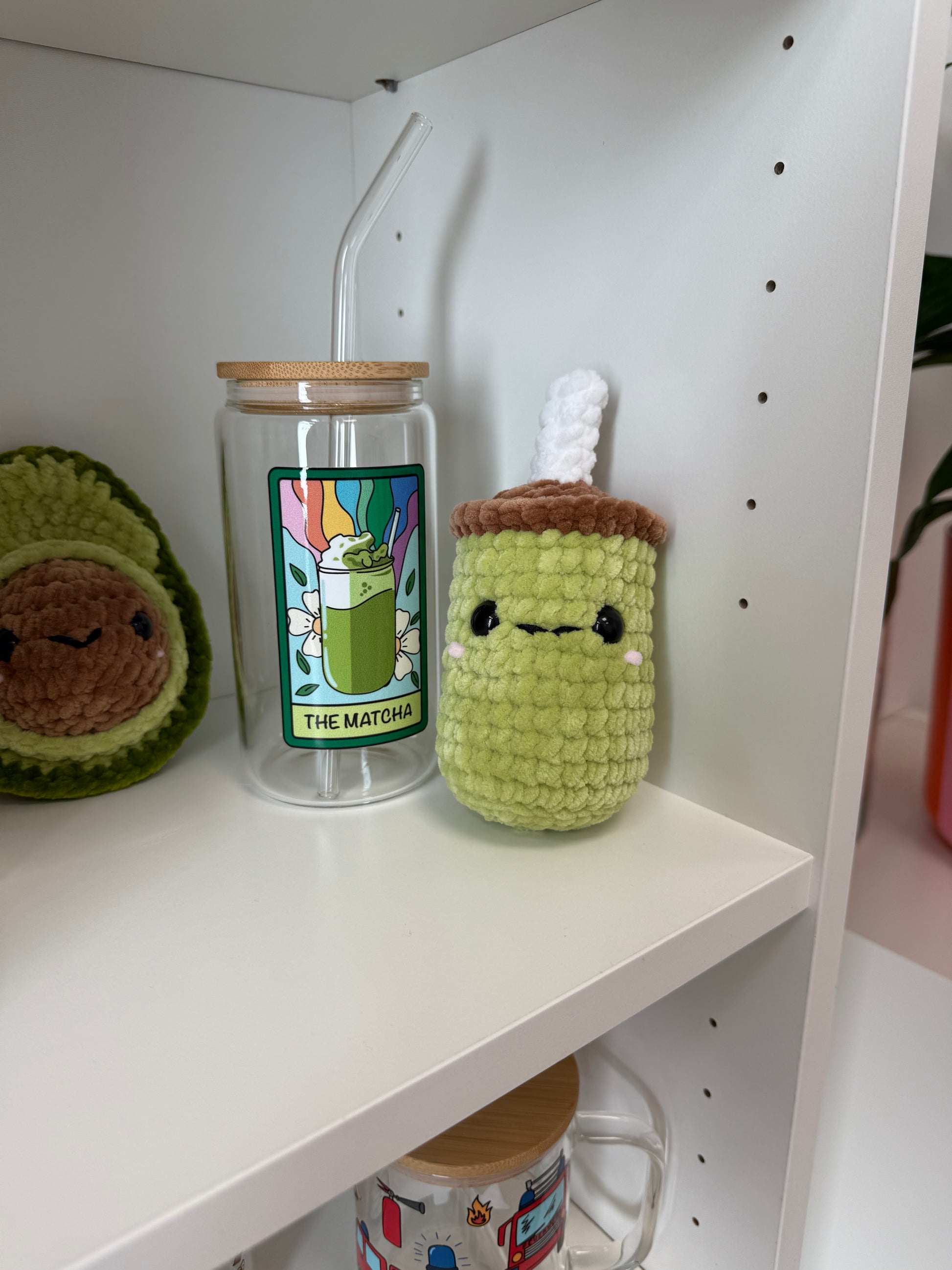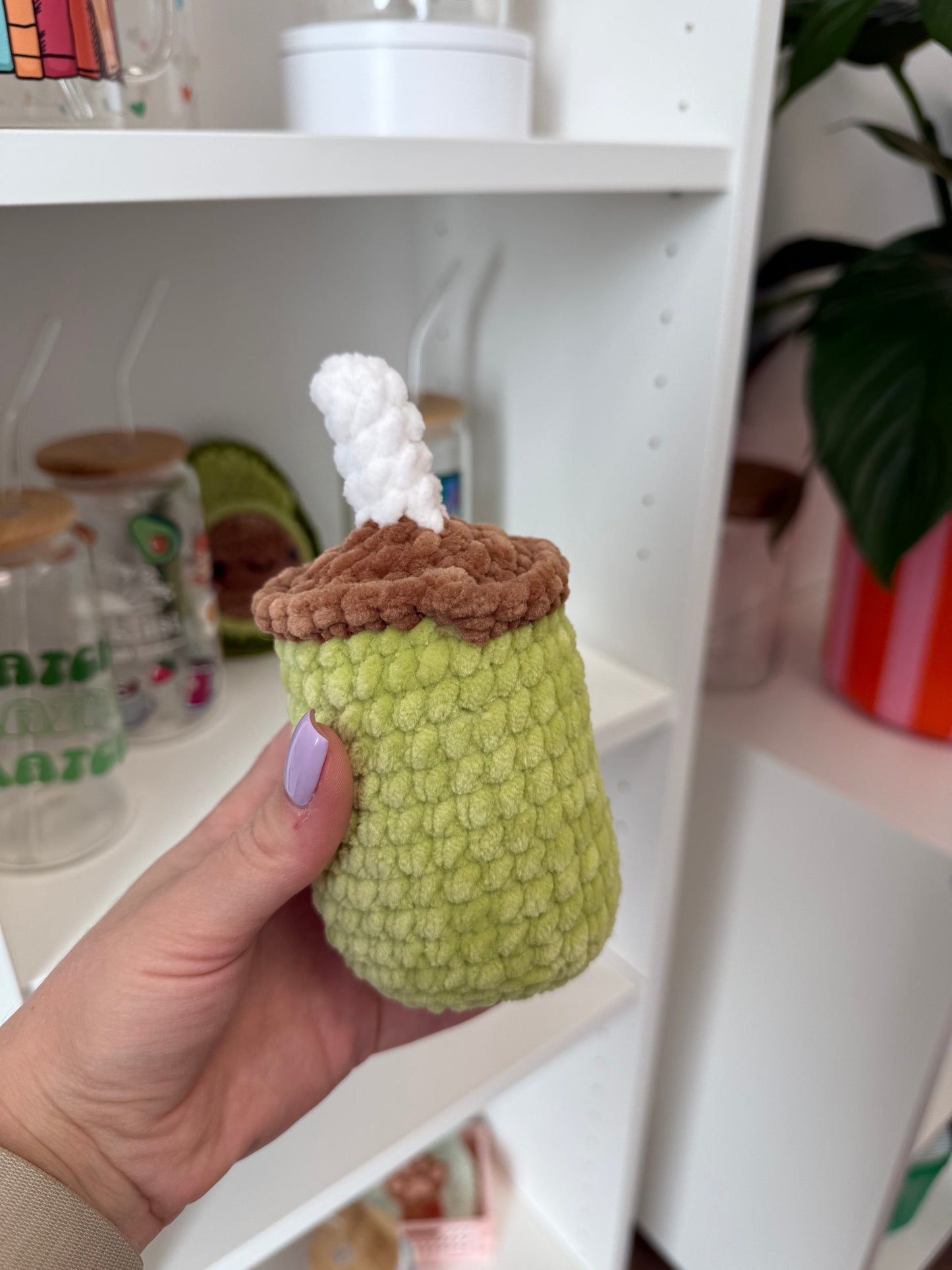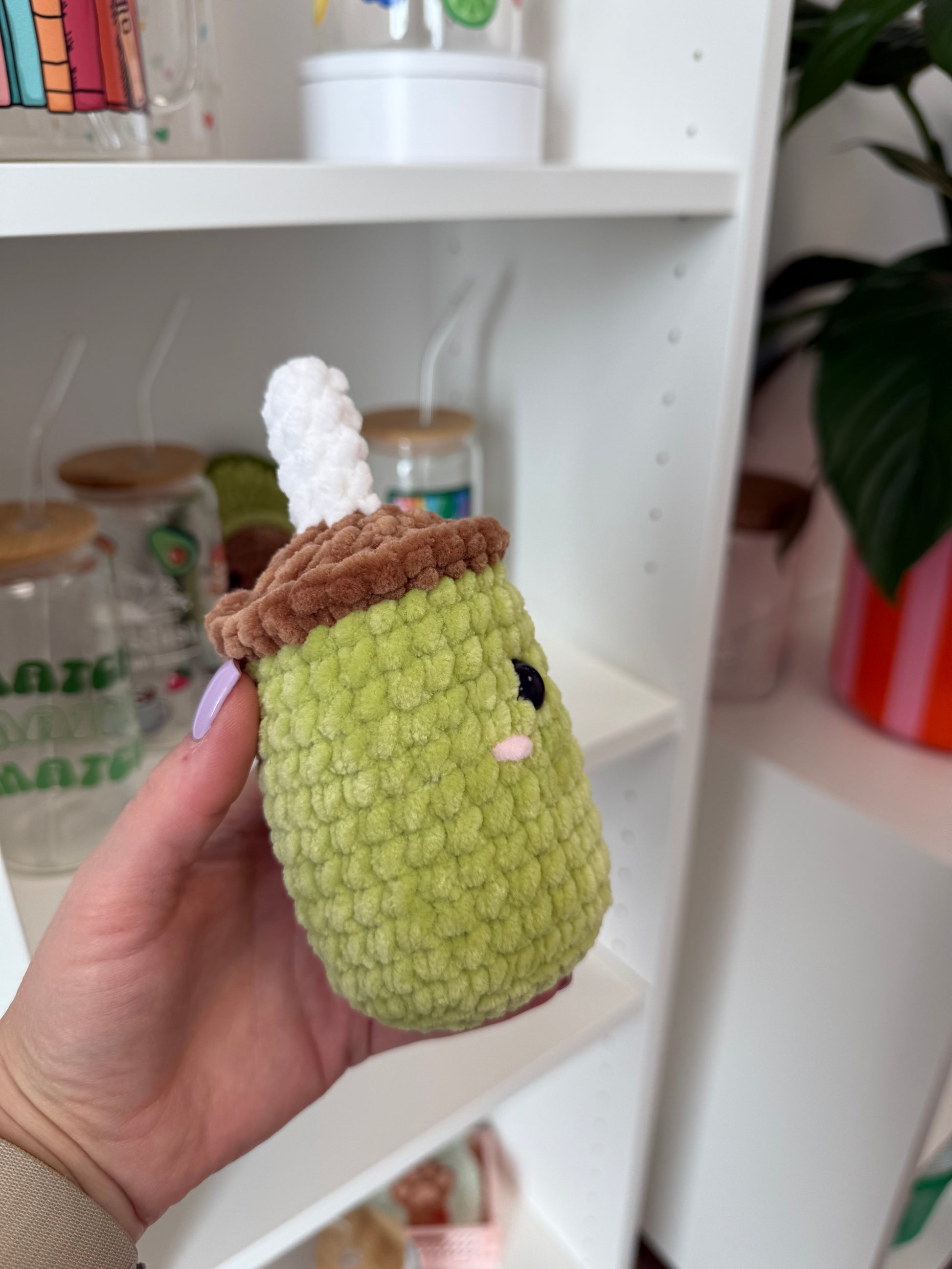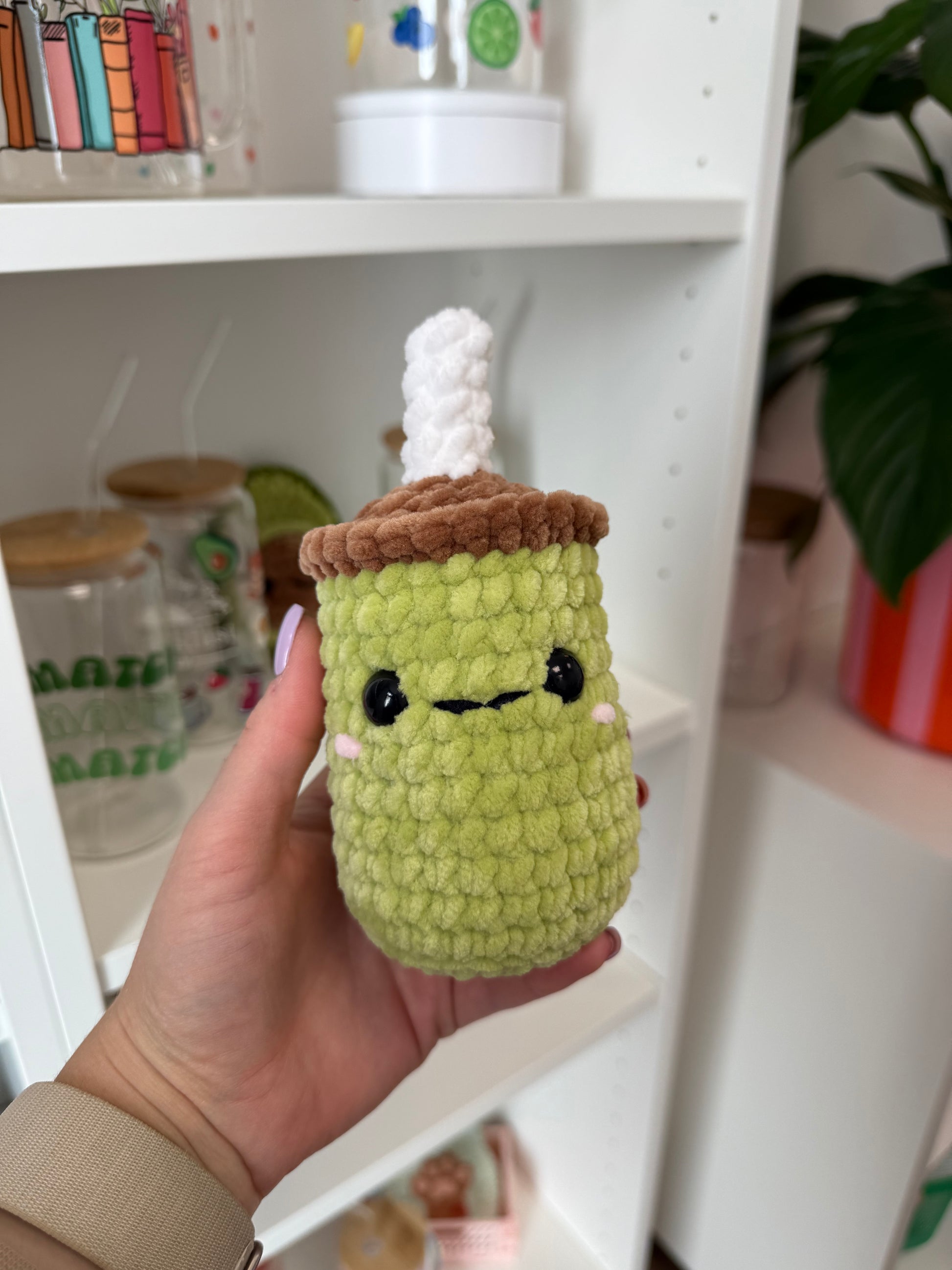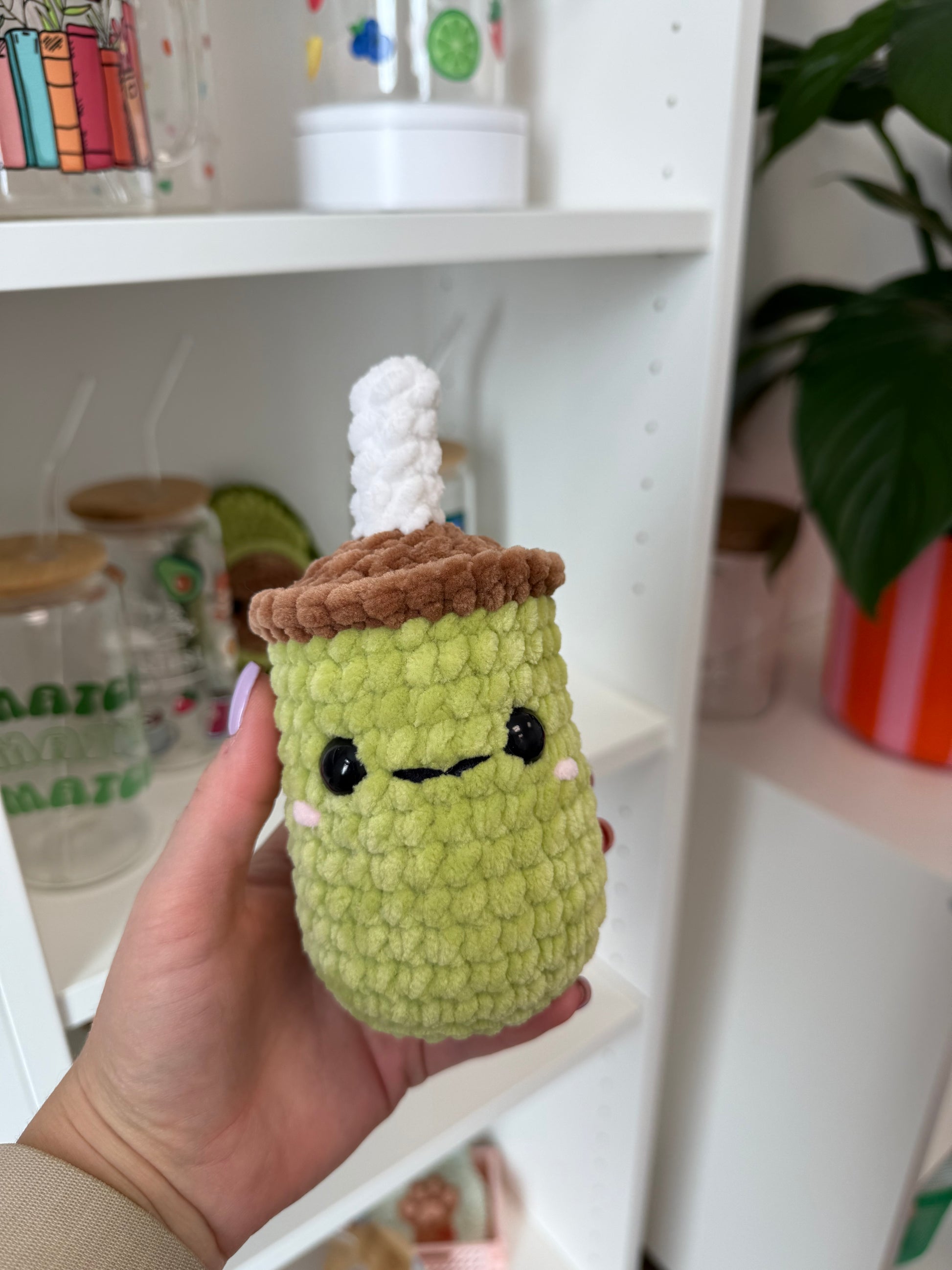 Dies ist ein kleiner selbst gehäkelter Matcha Cup, der dein neuer plüschiger Freund wird.