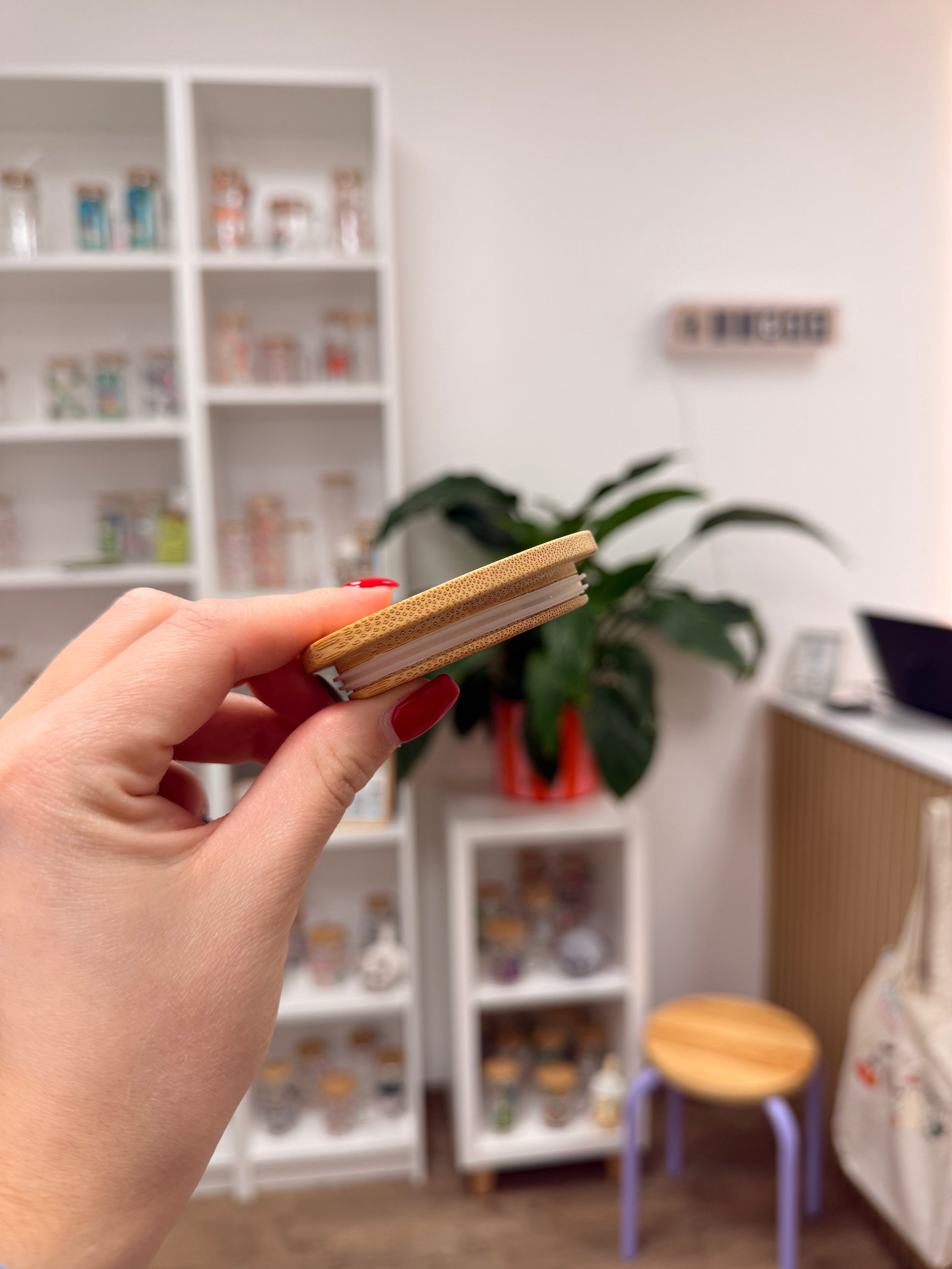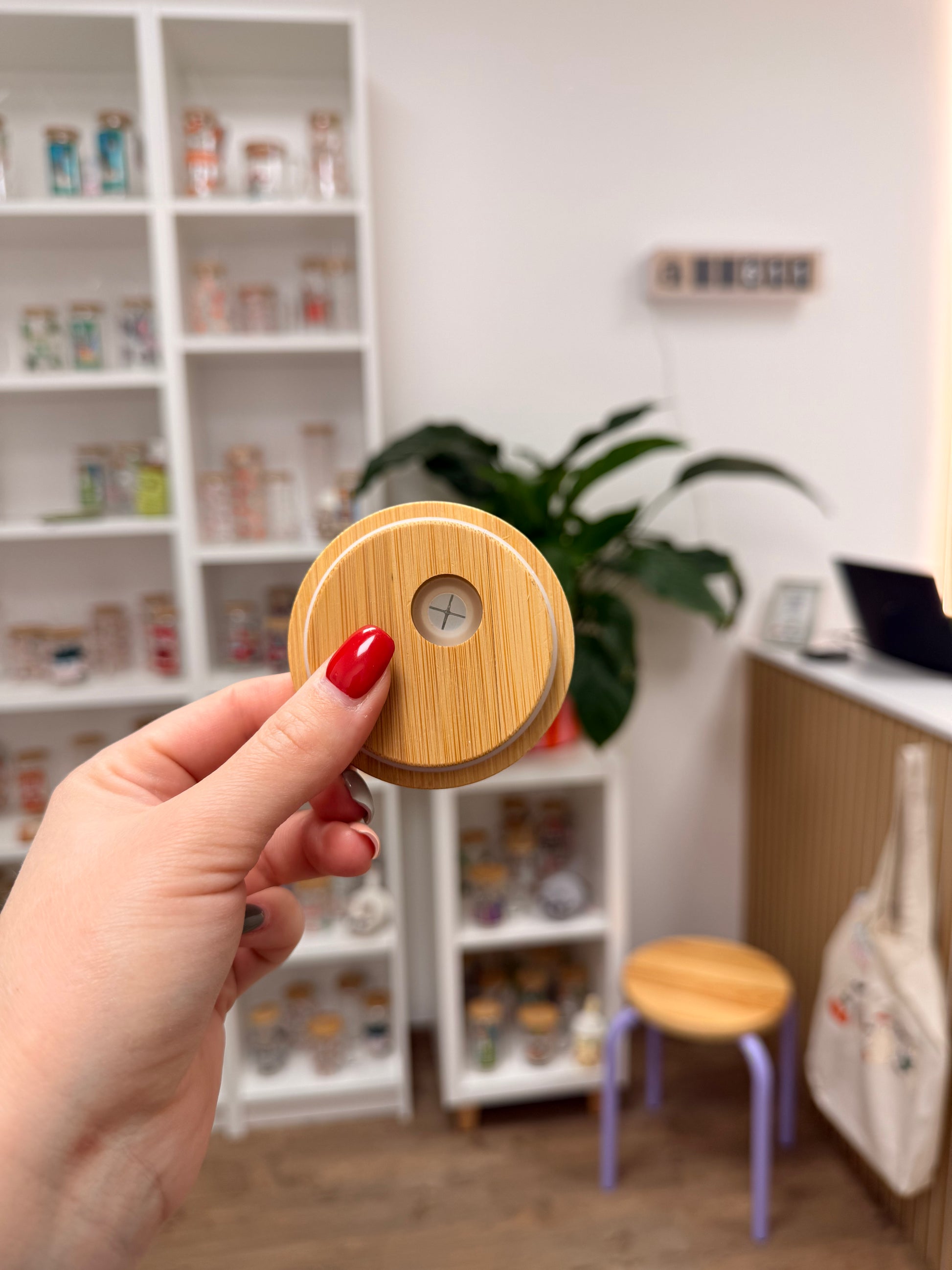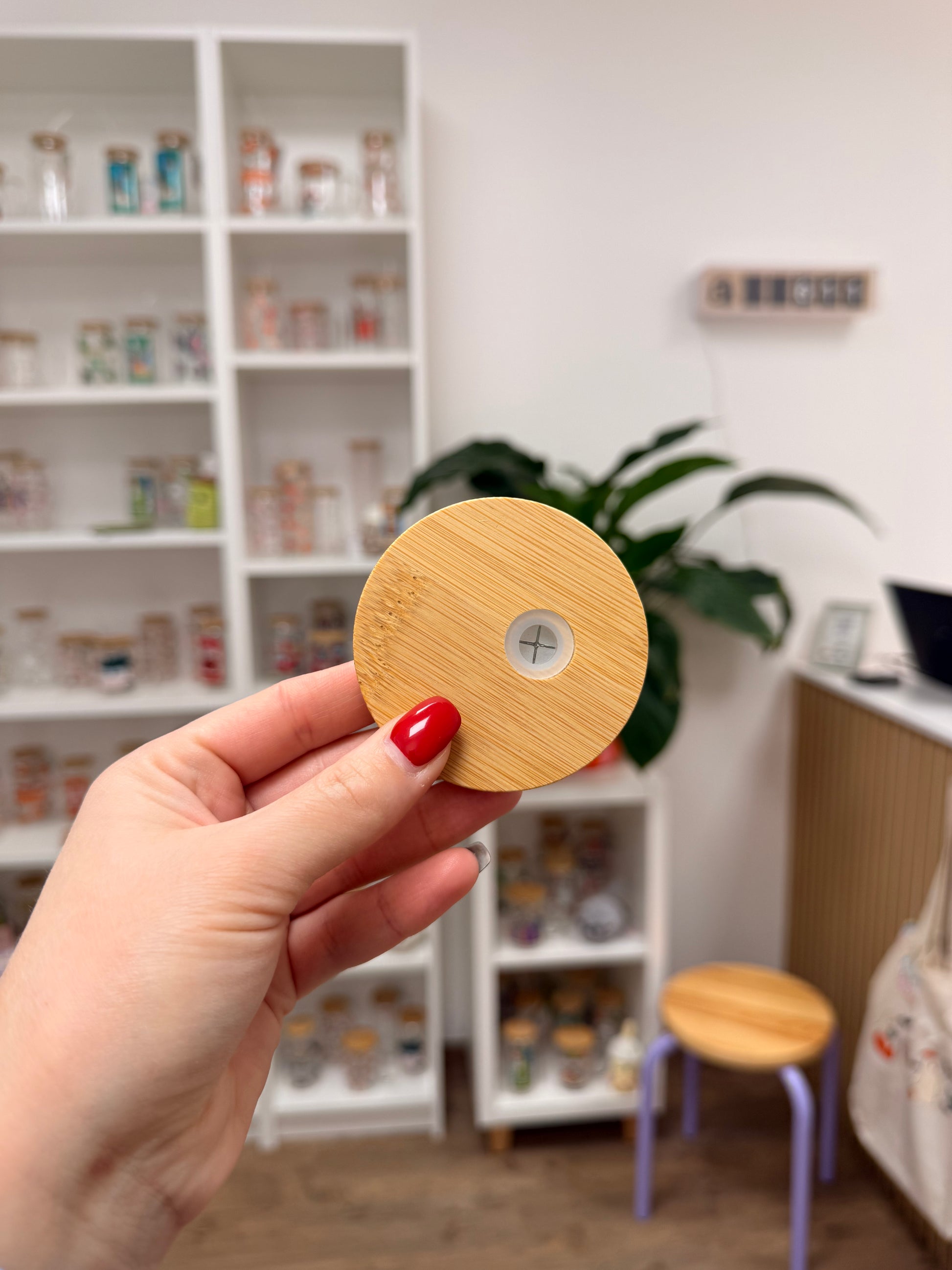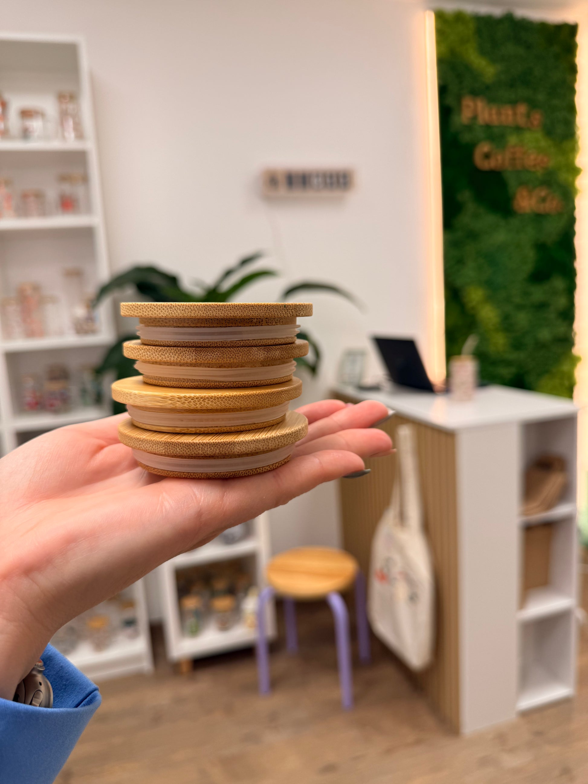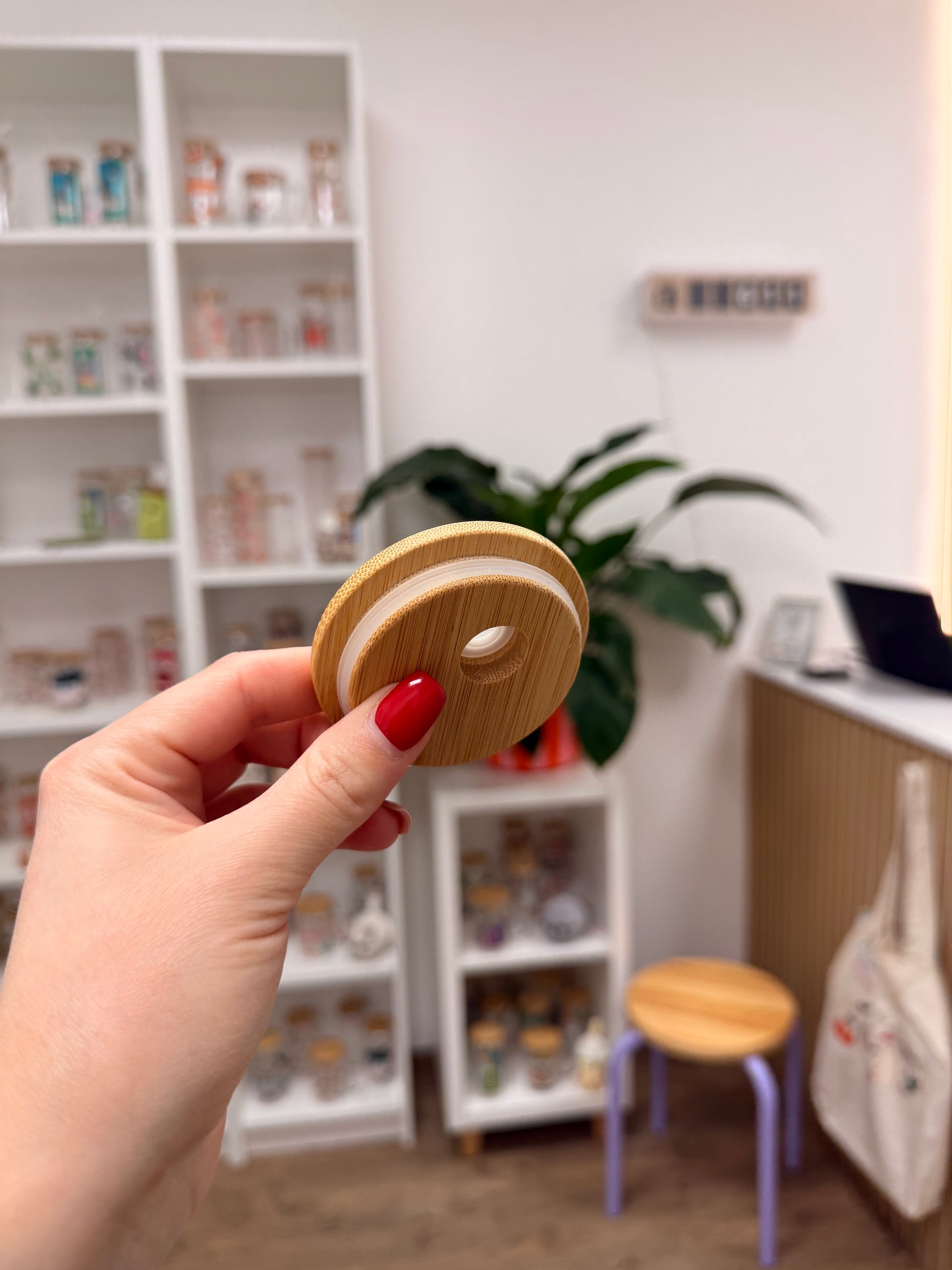 Dies ist der Bambusdeckel für die Glass Cups. Du kannst ihn nachträglich kaufen oder als Ersatz nehmen.