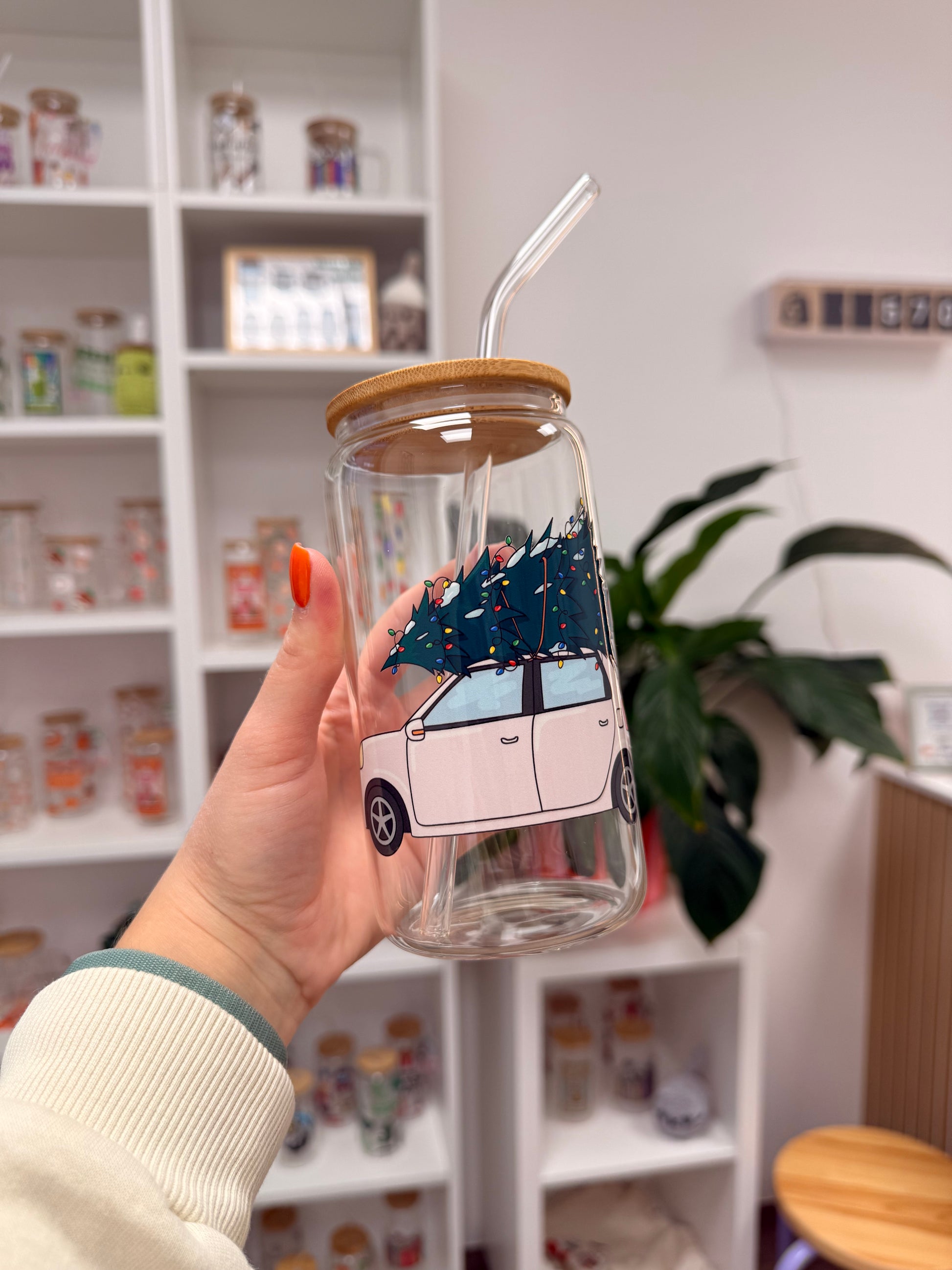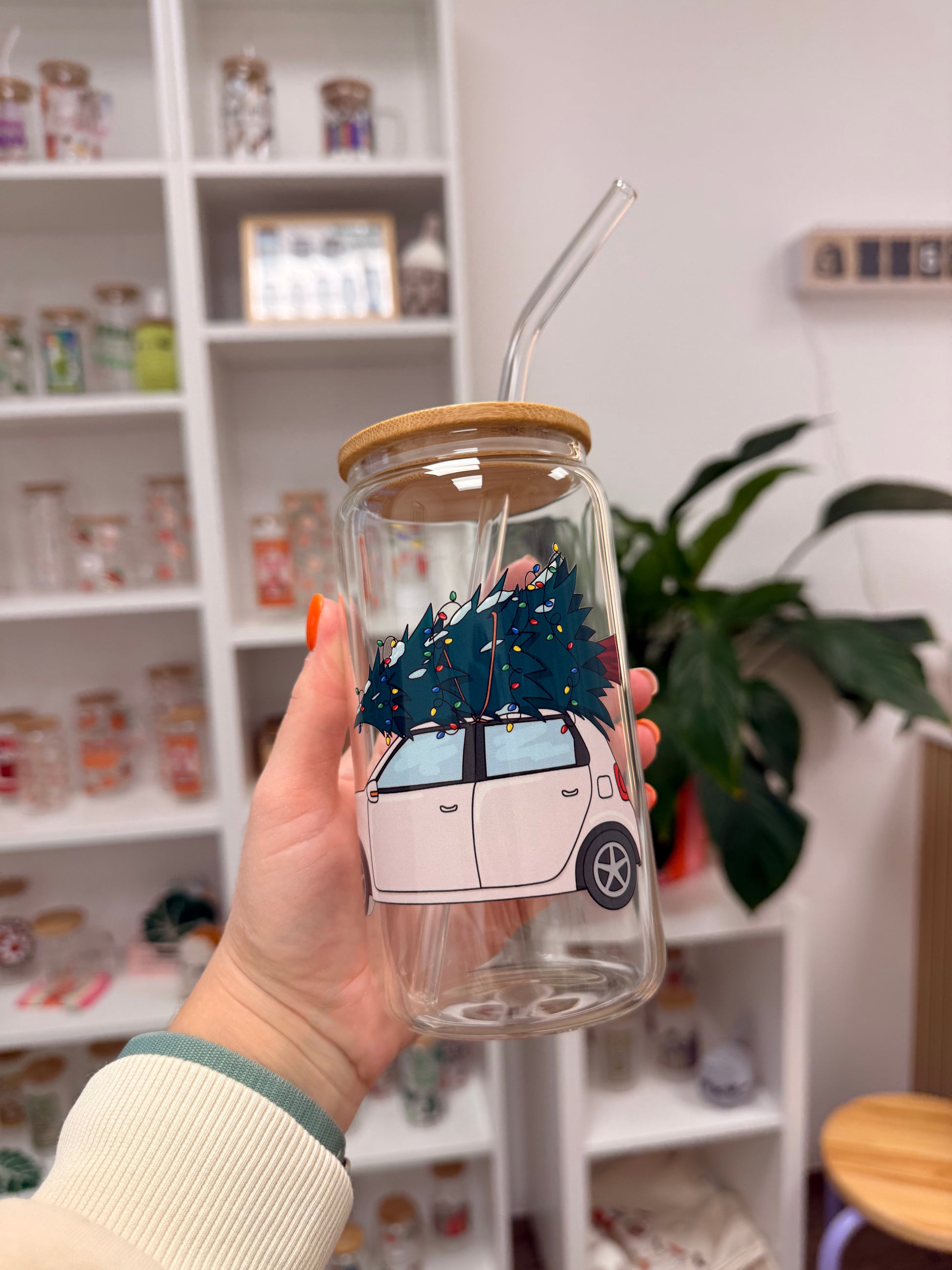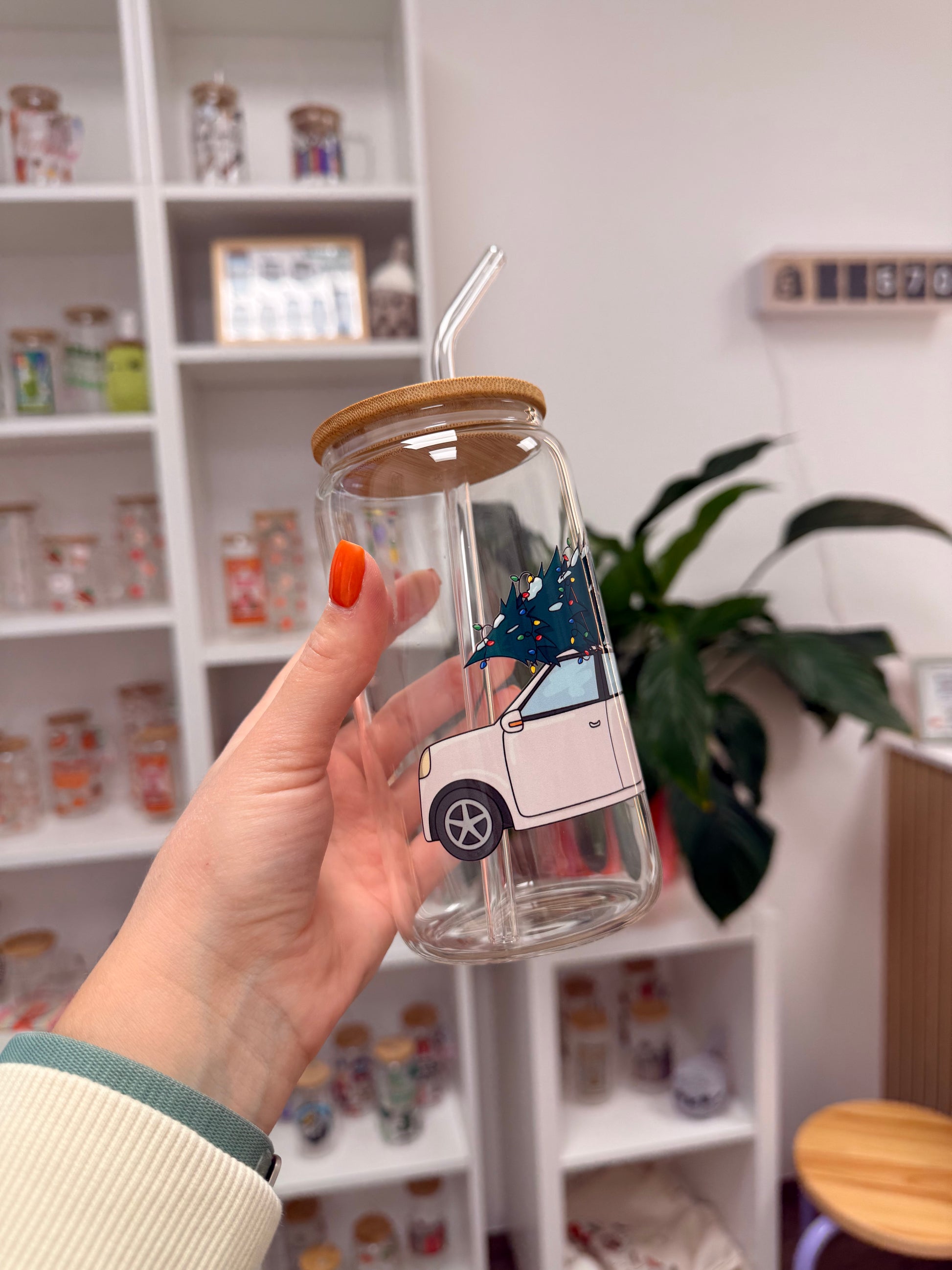 Dieser Glass Cup fasst 475ml von deinem Lieblingsgetränk! Er ist mit dem Design „Christmas Car“ gestaltet.