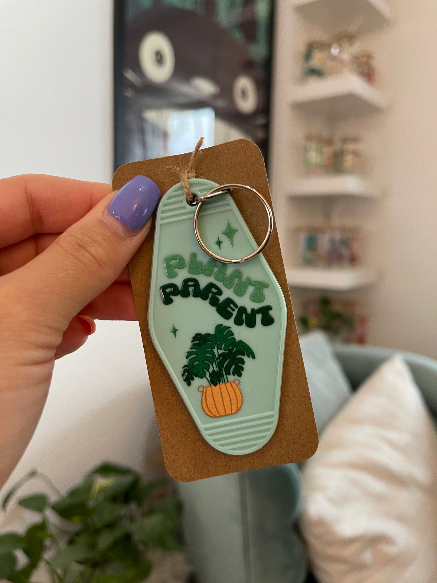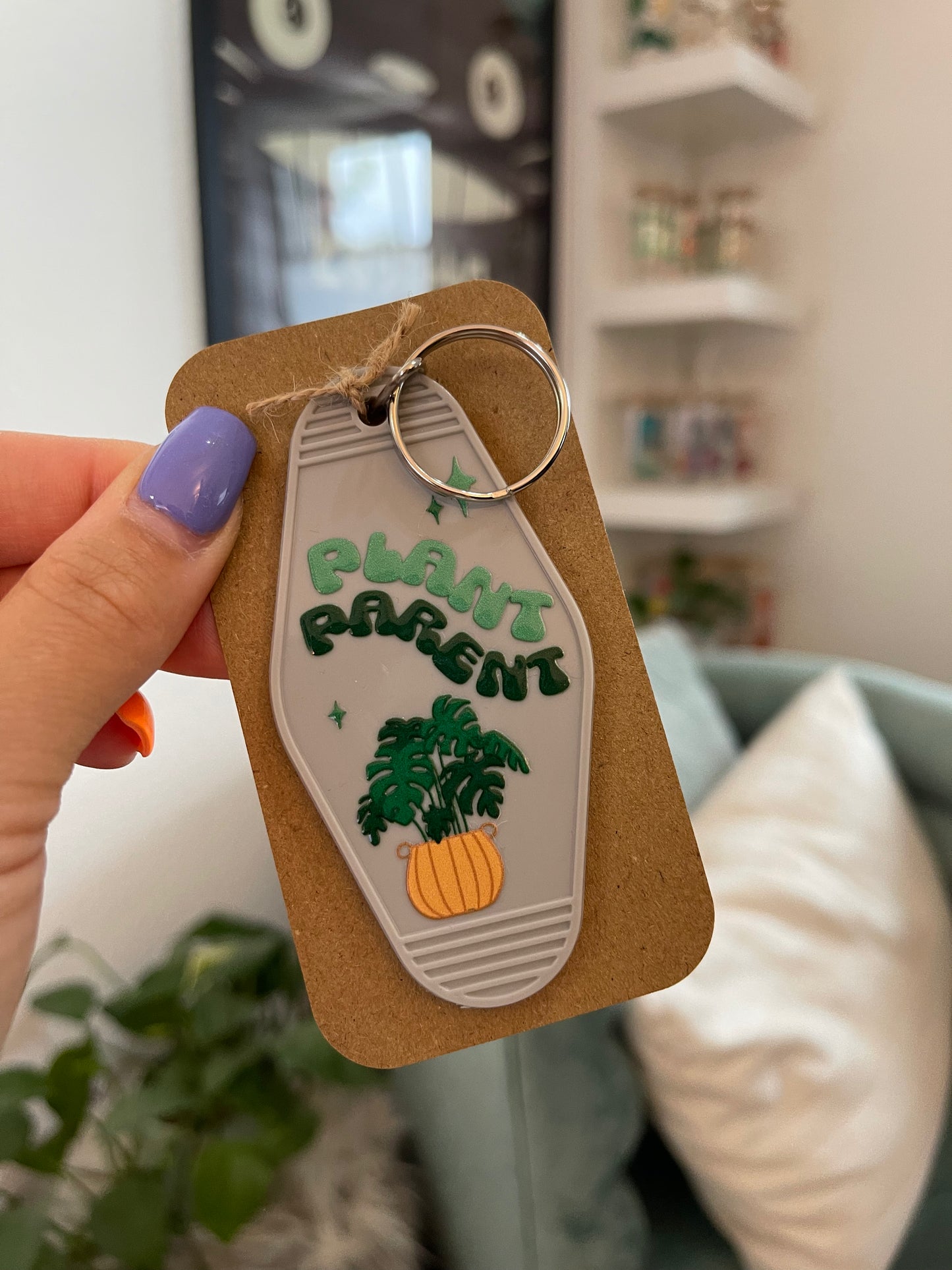 Dies ist ein Schlüsselanhänger im Vintage Motel Style, gestaltet mit dem Spruch "Plant Parent".